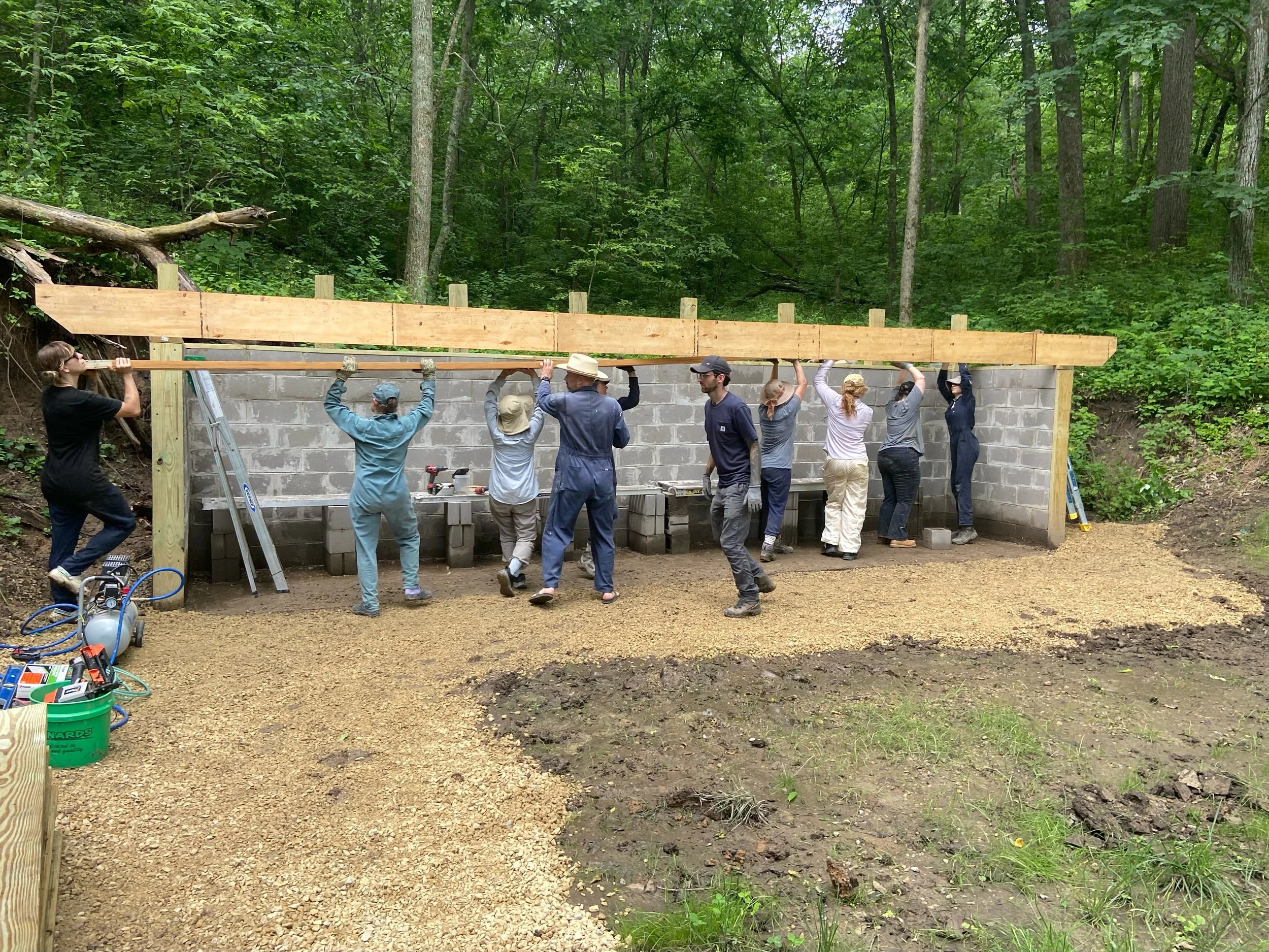 Fast forward to Spring of 2023 and we are breaking ground on a new full-range Kyudo facility. This time more accessible, just up the valley from the wood-fired ceramics kiln and across from an existing platform built for the annual Feast of the Senses. The ground was leveled between the platform and the site of the new Matoba to create the Yamichi, or ‘Arrow Path’. Five Sesshin and a few work days later, with a solid crew of Zen students and teachers wielding shovels and power tools, we now have a permanent home for the Kyudo program.